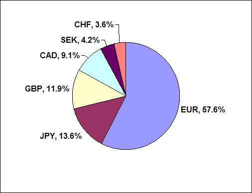 Sada kada znamo šta je to korpa valuta, vratimo se na "geometrijski ponderisani prosek". Budući da svaka zemlja nije iste veličine, normalno je da svaka ima odgovarajuću težinu kod proračunavanja US Dolar Indeksa. Pogledajte trenutne udele: